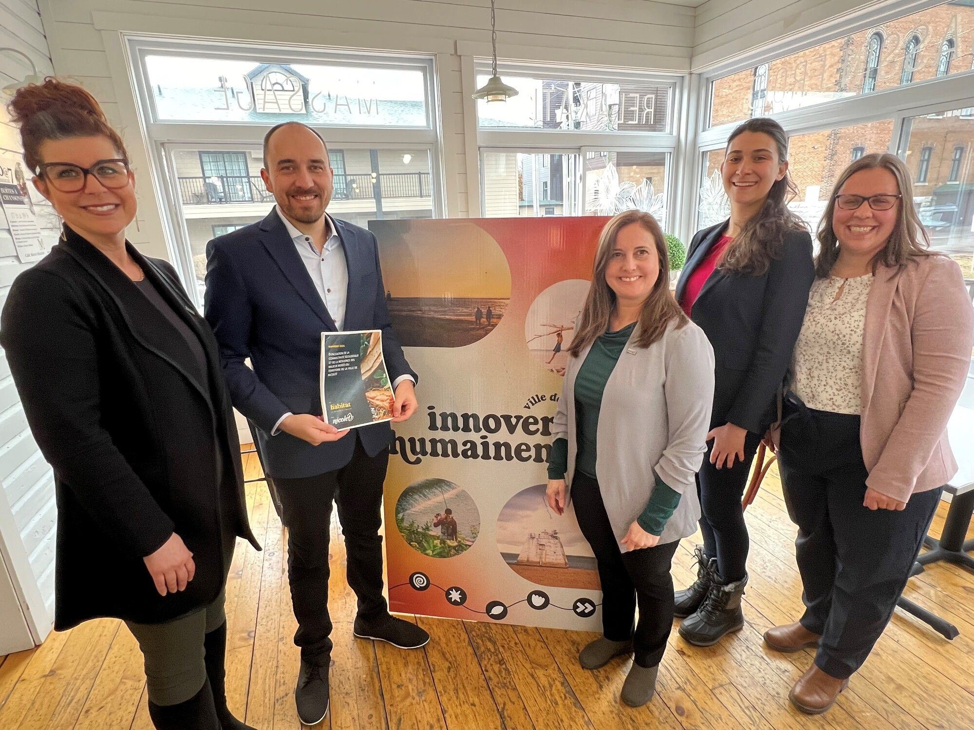 De gauche à droite : Geneviève Dubois, mairesse de Nicolet, Francis Clément, directeur des projets et opération - Habitat, Stéphanie Dufresne, coordonnatrice du Bureau de la transition écologique et de l'innovation de Nicolet, Karine Labelle, coordonnatrice à la conservation chez Nature-Avenir, Stéphanie Lord, administratrice Nature-Avenir