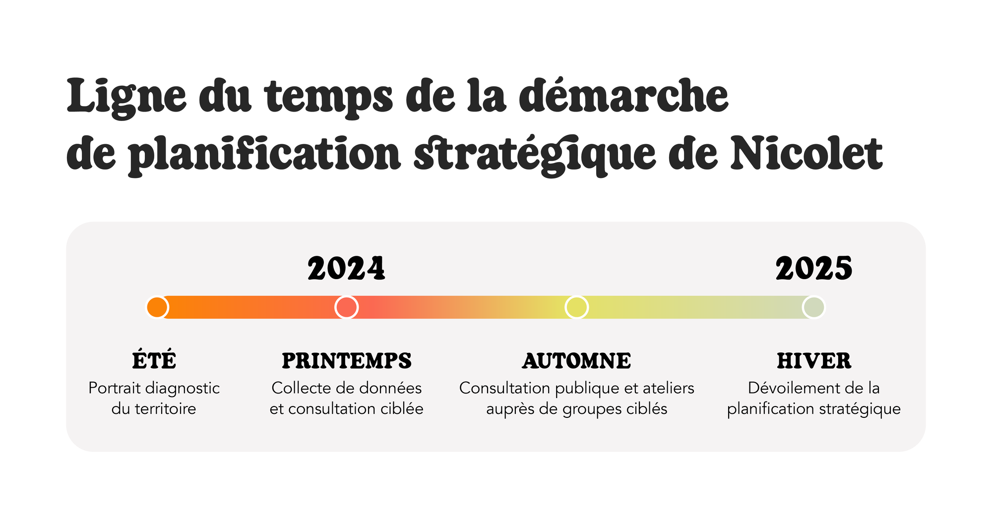 Une consultation publique ouverte à toute la population Les citoyen.ne.s de Nicolet sont invité.e.s à consulter le portrait diagnostic et à exprimer leurs priorités dans le cadre d'une consultation publique en ligne, qui se tiendra du 12 septembre au 11 octobre sur une nouvelle plateforme de participation citoyenne. Les résultats orienteront la planification stratégique qui sera lancée cet hiver.