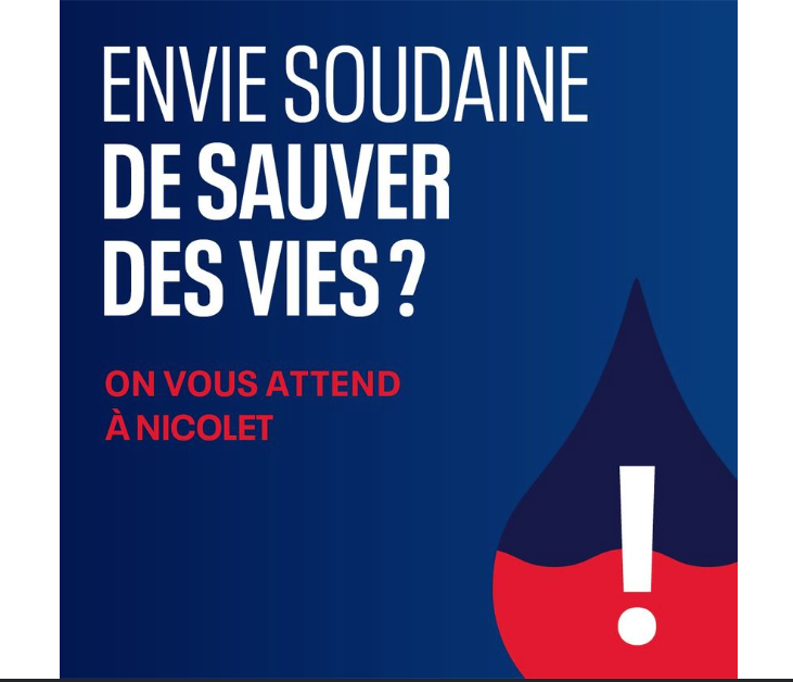 Aux résidents de Nicolet, [80 donneurs recherchés] Collecte de sang à la ville de Nicolet.